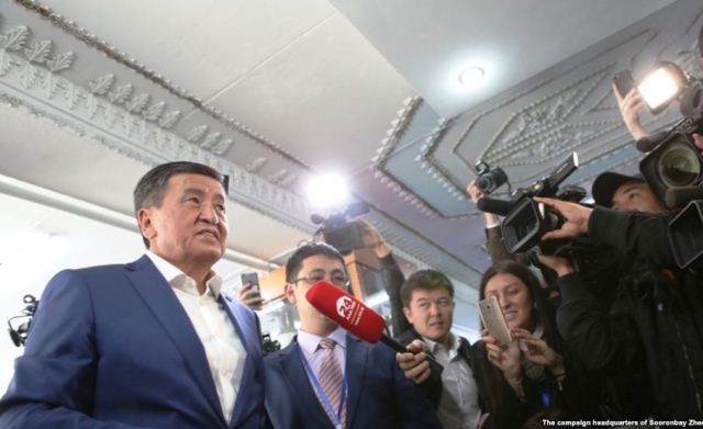 Более 914 тысяч избирателей поддержали кандидата от Социал-Демократической партии Сооронбая Жээнбекова, что составляет около 54 процентов голосов. Жээнбеков — ближайший союзник действующего президента Алмазбека Атамбаева, который не баллотировался на этих выборах из-за предусмотренного в Конституции запрета на выдвижение на второй срок. Для победы в первом туре необходимо набрать более 50 процентов голосов избирателей, принявших участие в выборах.
