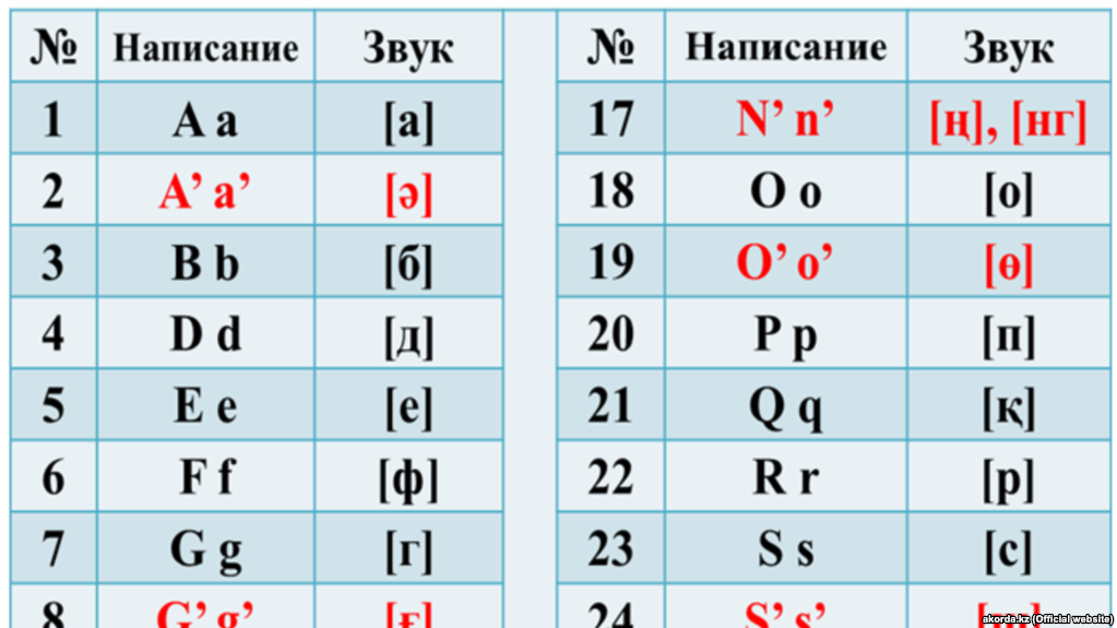 В приложении к указу представлен вариант алфавита на латинице, состоящий из 32 букв, в котором несколько специфических звуков казахского языка отображены на письме через добавление апострофа.
