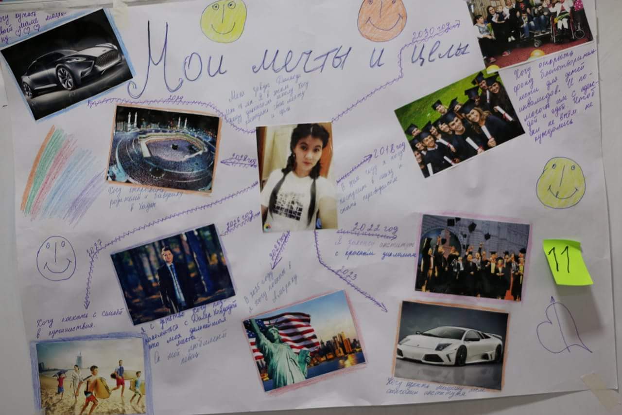 По ее словам, каждый коллаж был по-своему уникален, так как он отображал мечту участника. «Каждый хотел творчески отнестись к своей работе, — отмечает Гузал. — Самое удивительное то, что таким образом участники смогли показать свои цели в жизни и определить время их достижения. Яркая цветовая гамма коллажей указывает на то, что мир участников полон надежд и добра».