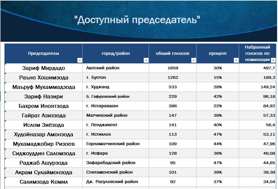 «Доступный председатель» – Зариф Мирдадо, председатель Аштского района Согдийской области, который всего набрал 1659 голосов из которых 30% или 497,7 голосов отдано за указанную номинацию.