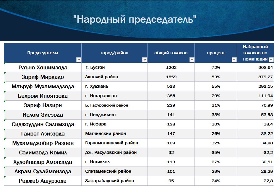 «Народный председатель» – Раъно Хошимзода, председатель города Бустон Согдийской области (набрала 1262 голосов, из которых 72% или 908,64 гол. за указанную номинацию).