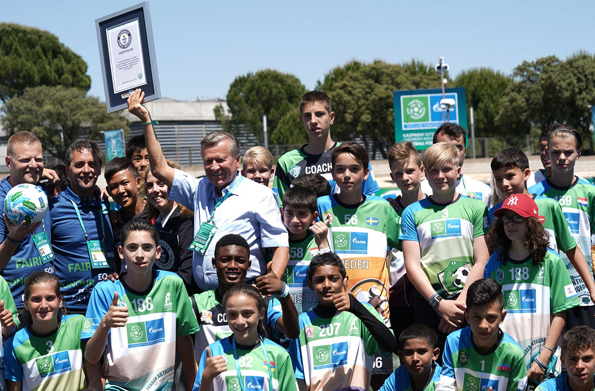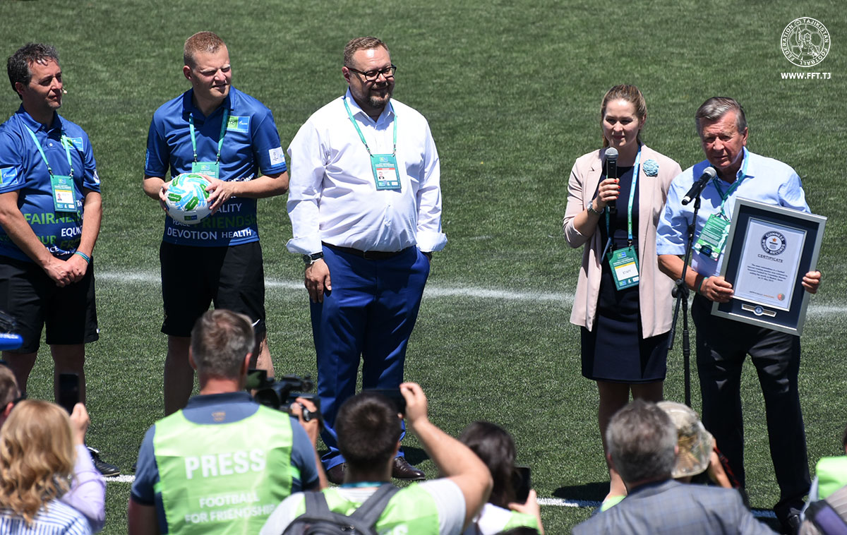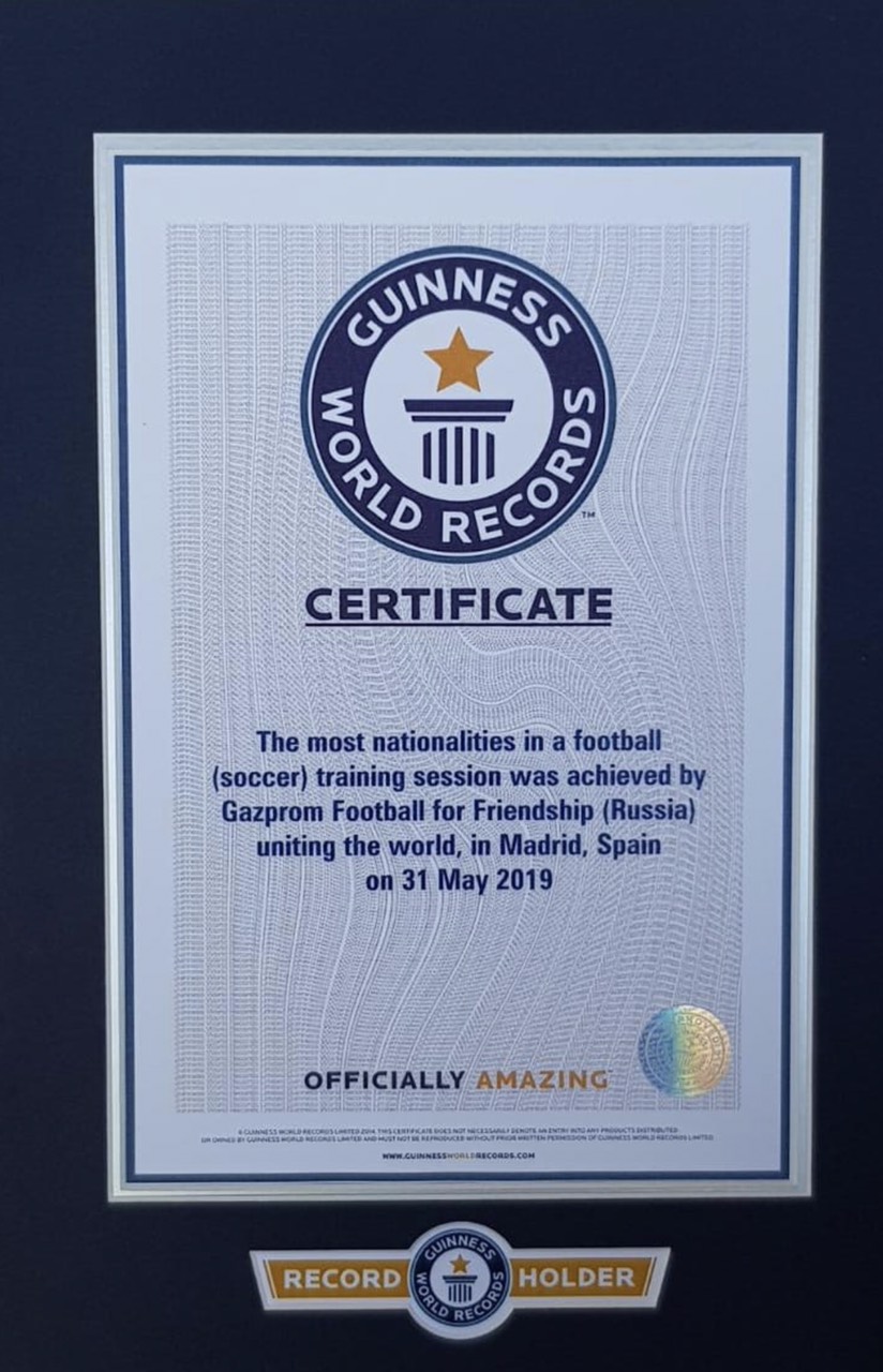 По окончании тренировки председатель совета директоров ПАО «Газпром» Виктор Зубков получил от представителя Книги рекордов Гиннесса официальный сертификат об установлении рекорда и поздравил юных участников «Футбола для дружбы» с этой победой.