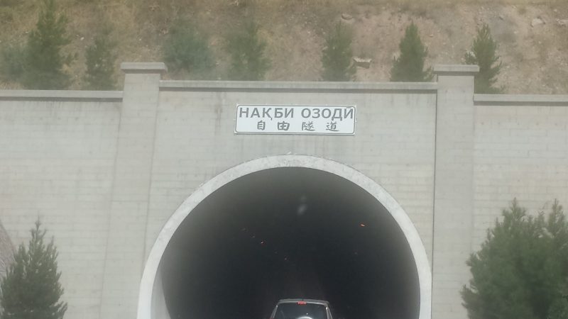 ВХОД В ТОННЕЛЬ “СВОБОДА” НА ЮГЕ ТАДЖИКИСТАНА ПО ДОРОГЕ В ДУШАНБЕ. НАДПИСЬ НА ТАДЖИКСКОМ И КИТАЙСКОМ: “ТОННЕЛЬ СВОБОДА”, 2016 г.
