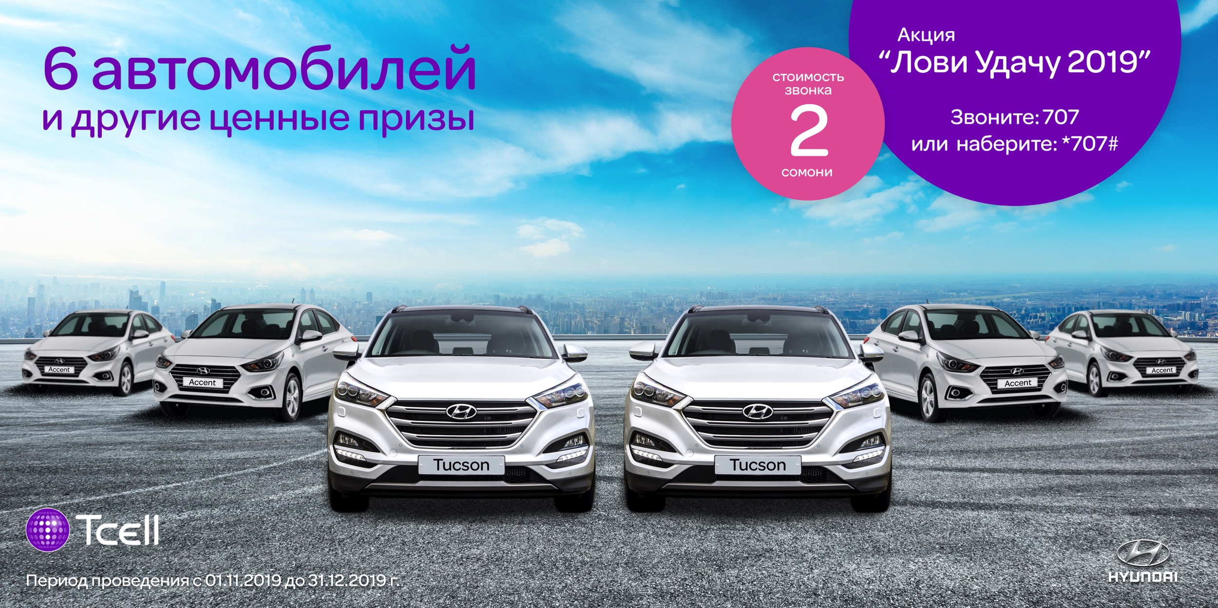 Телекоммуникационная компания Tcell анонсировала запуск акции «Лови Удачу». Призовой фонд акции составляют 6 автомобилей Hyundai по РТ, из которых 3 автомобиля предназначены для абонентов Согдийской области, а также другие призы – ноутбуки, смартфоны и Smart TV. Данная акция проводится по всей стране и участвовать в ней могут абоненты компании.