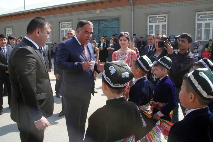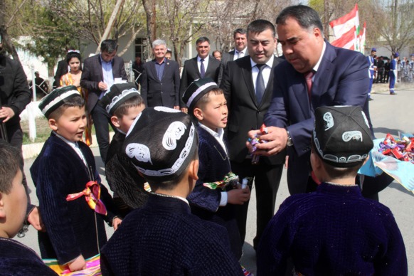 Первыми руководителя Согда поздравили мальчики и девочки джамоата. Они преподнесли Раджаббою Ахмадзода символ весны – подснежники.