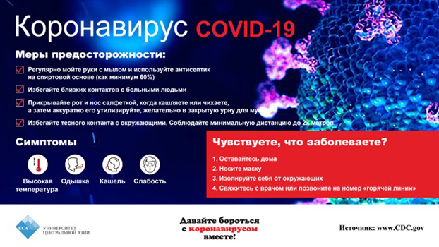 Как сообщает сайт УЦА, в рамках мер по сдерживанию распространения вируса COVID-19 УЦА распространил в Нарыне (Кыргызстан) и Хороге (Таджикистан) информационные плакаты.