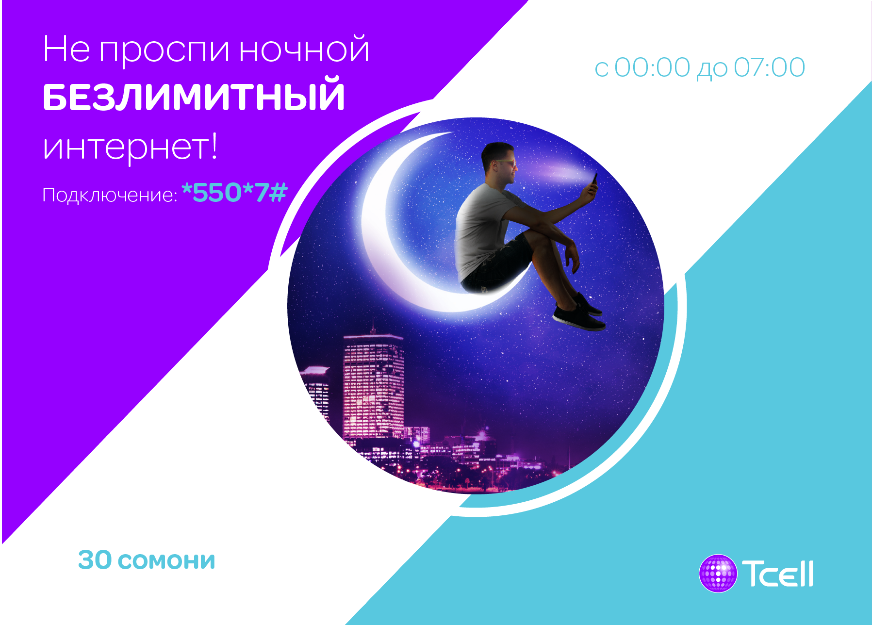 Специально для активных пользователей мобильного интернета в ночное время, Tcell представляет опцию «Ночной безлимит». Опция предоставит абонентам неограниченный доступ в интернет с 00:00 до 07:00, без каких-либо ограничений, всего за 30 сомони в месяц!