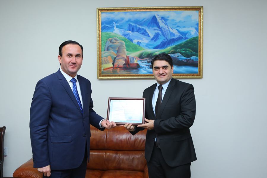 На официальной встрече, Председатель Комитета по делам молодежи и спорта Таджикистана Абдулло Рахмонзода торжественно вручил государственную аккредитацию Председателю Федерации велосипедистов РТ Озодхону Давлатшоеву.