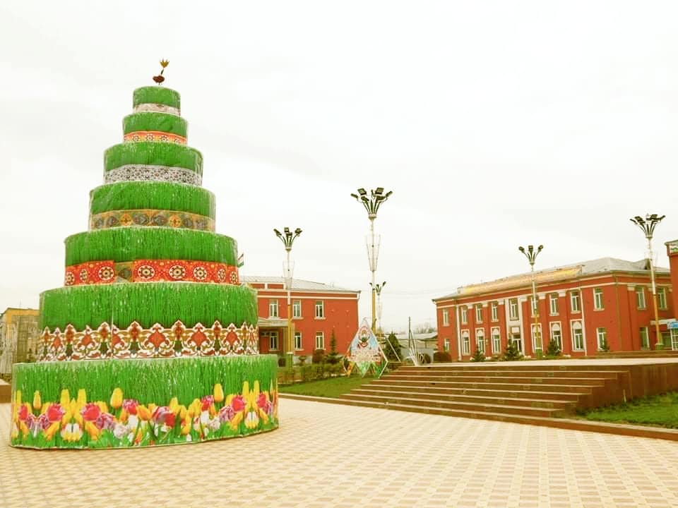 В центре города Истаравшан установлен символ праздника Навруз — суманак, заросшие зерна пшеницы.
