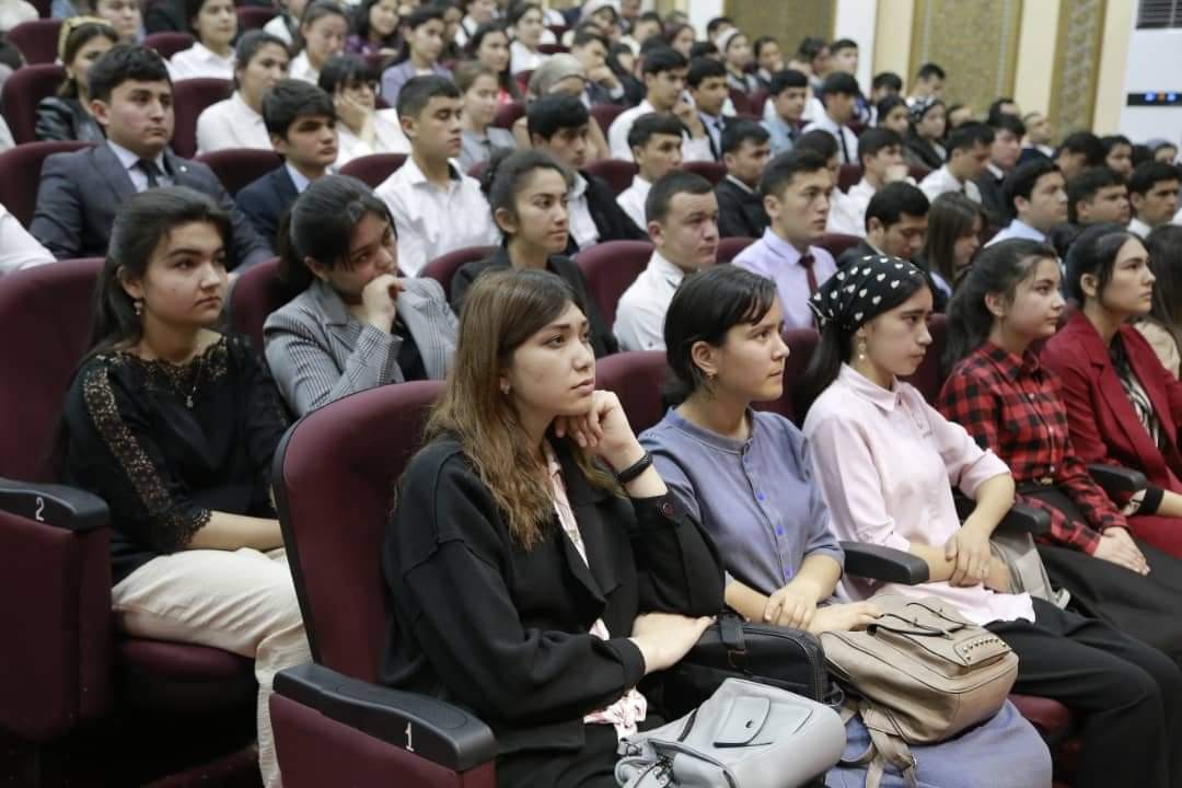 Встреча председателя города Канибадам Абдусалома Тухтасунзода со студентами, обучающимися в вузах и колледжах административного центра Согдийской области, прошла во Дворце молодежи города Худжанда.