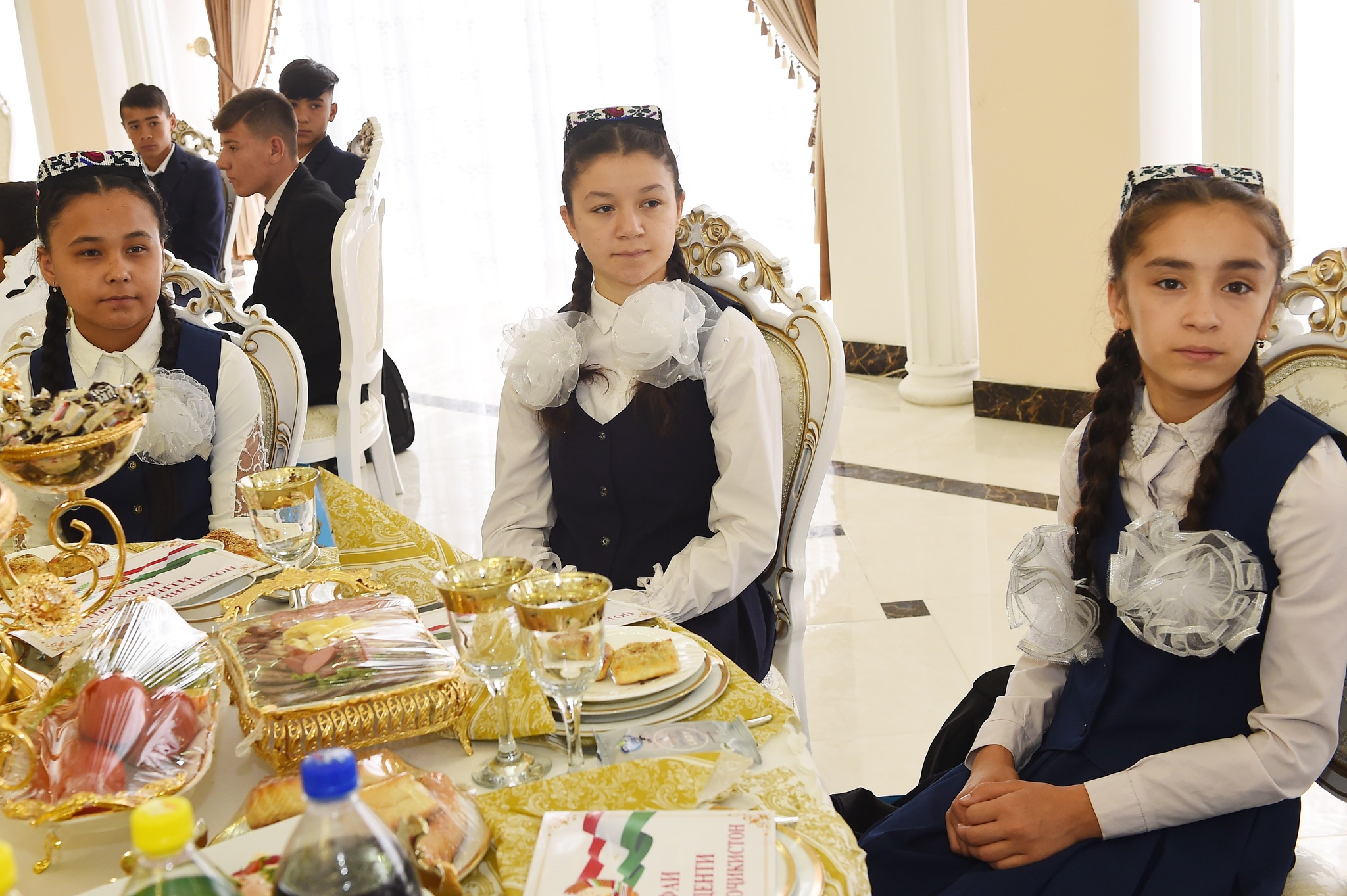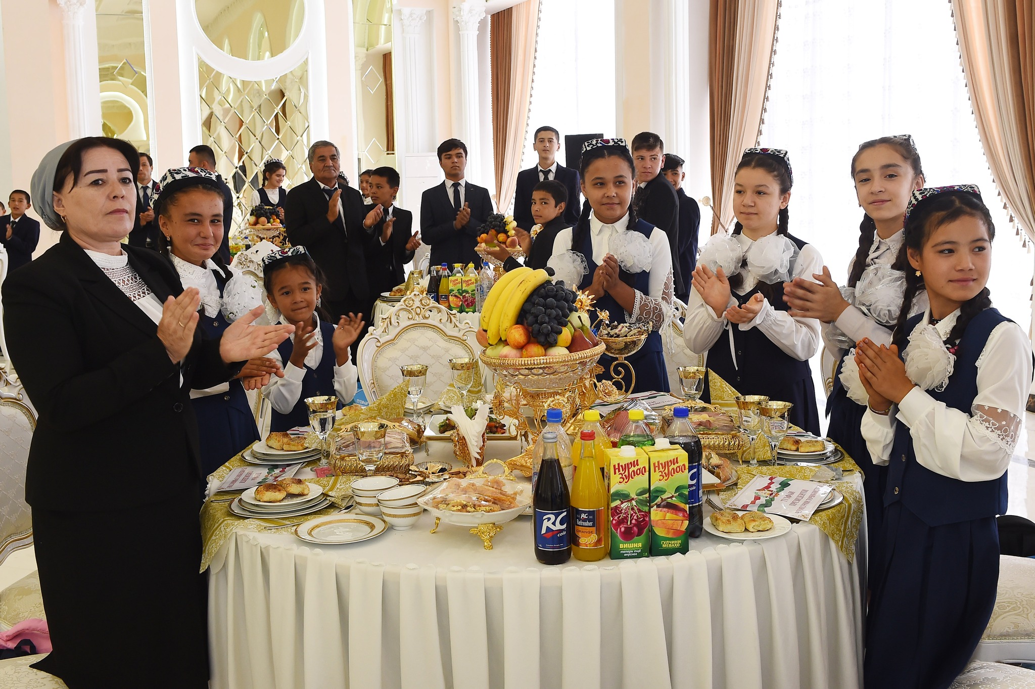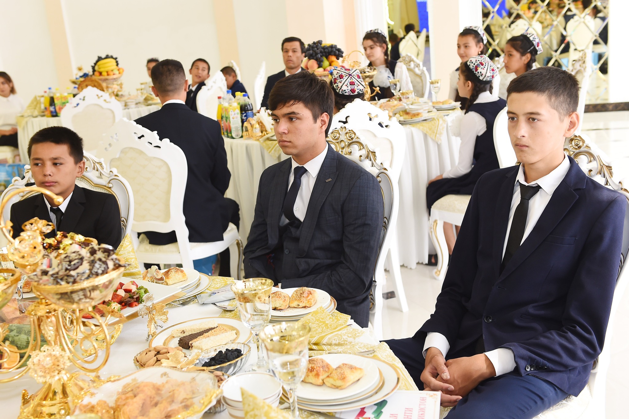 В банкетном зале комплекса глава государства встретился с 100 круглыми сиротами из Канибадама, Джабборрасуловского и Бободжонгафуровского районов. Детям были вручены материальная помощь и подарки.
