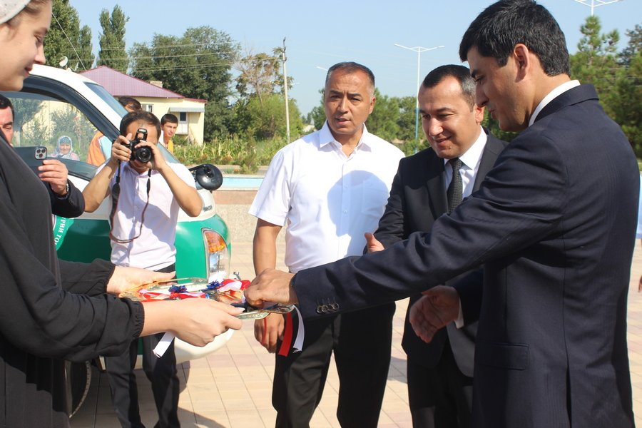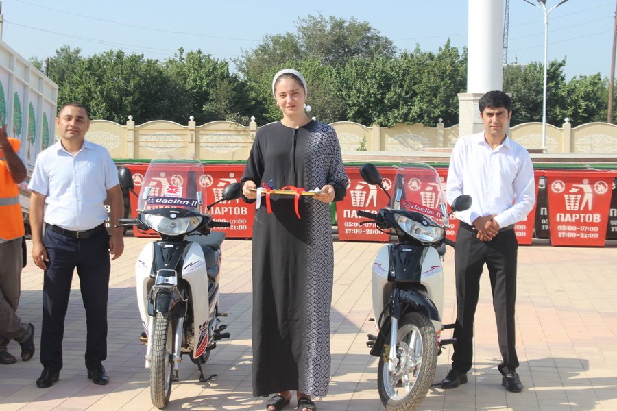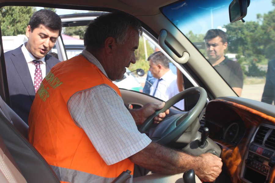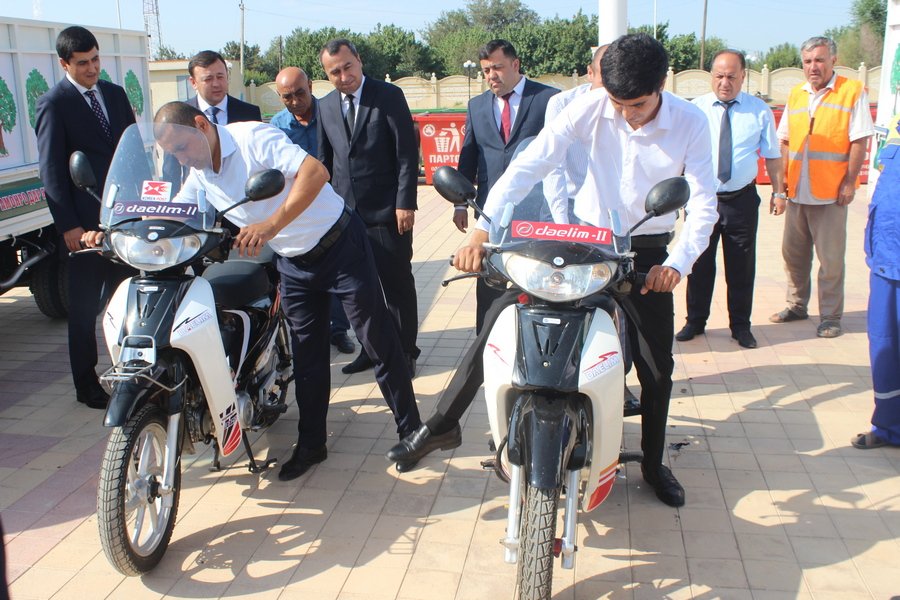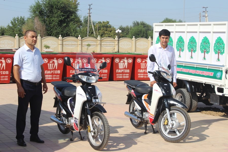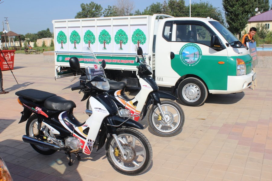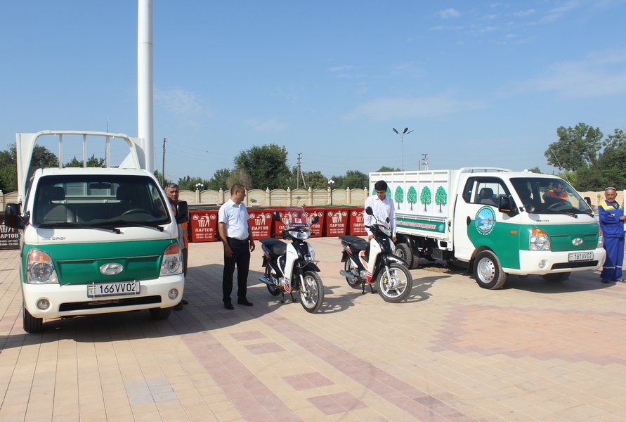В торжественной обстановке коммунальщикам района были переданы 2 мусоровоза марки “Hyundai Porter», 2 скутера и 40 штук контейнеров для мусора.