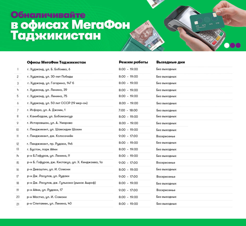 МегаФон Таджикистан открывает салоны связи в самых людных местах: в торговых центрах, возле рынков, автовокзалов. Поэтому услуга «Cash Out» — часто самый простой способ получить наличные деньги.